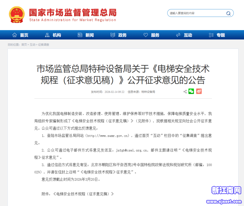 为优化我国电梯制造安装、改造修理、使用管理、维护保养等环节技术措施,保障电梯质量安全水平,我局组织专家编制形成了《电梯安全技术规程(征求意见稿)》(见附件),现根据相关规定向社会公开征求意见。公众可通过以下方式提出反馈意见: