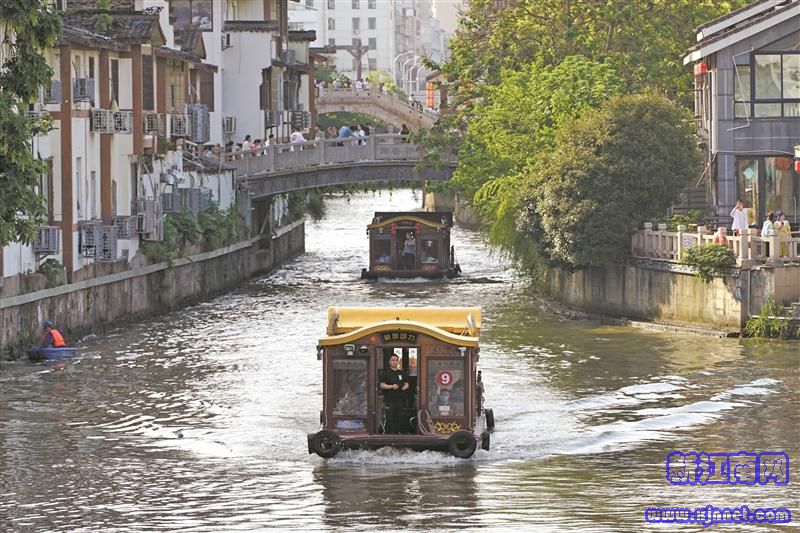2日,游客乘坐水上专线巴士从古运河“水弄堂”进入清名桥历史文化街区。(卢易 摄)