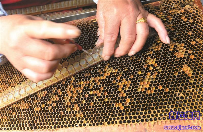 戴上环披着纱帐的帽子,姚海和走近一个蜂箱,利索地抽出其中一块插在蜂箱内存储蜂蜜的木板,顿时成群的小蜜蜂围着他四散飞舞。这样的场面姚海和早就习惯了,任凭蜜蜂爬满整条手臂,他依旧自顾自地查看木板上蜂蜜的情况。他们就不会被蜜蜂蜇吗?姚海和指着手上的肿块说,养蜂人被蜜蜂蜇简直是家常便饭,“基本上每天都会被蜇几口,有时候甚至被蜇几十口,就当去做蜂疗吧”。