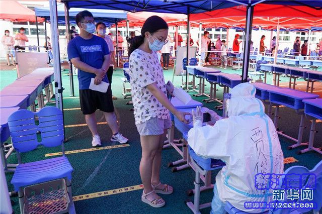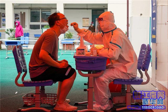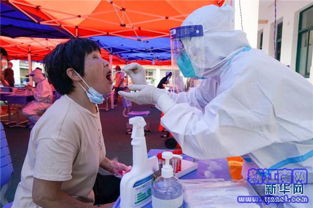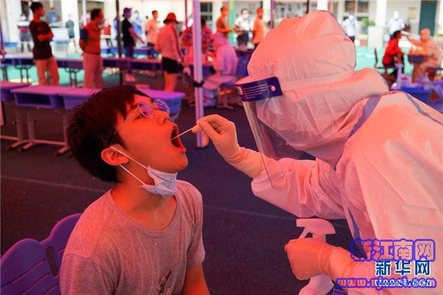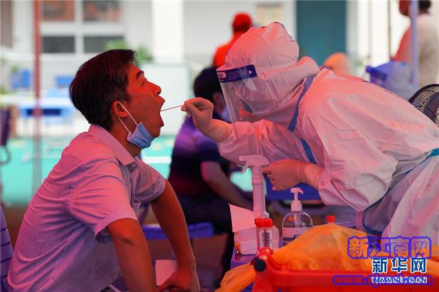8月11日,市民在扬州市广陵区汶河街道一处核酸检测点进行核酸检测取样。