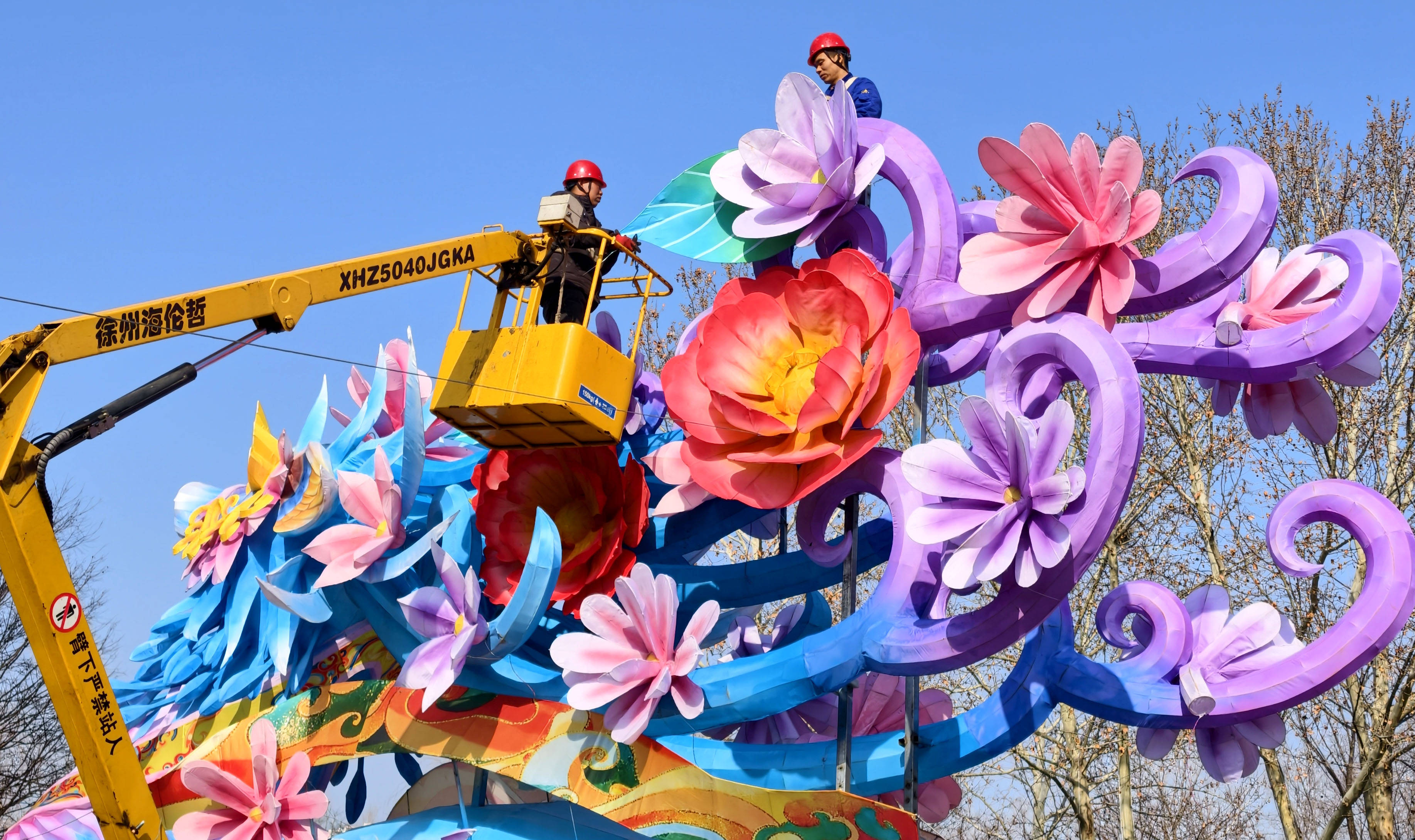 2月2日,在洛阳隋唐遗址植物园,工作人员在安装花灯。 新华社发(高山岳摄)