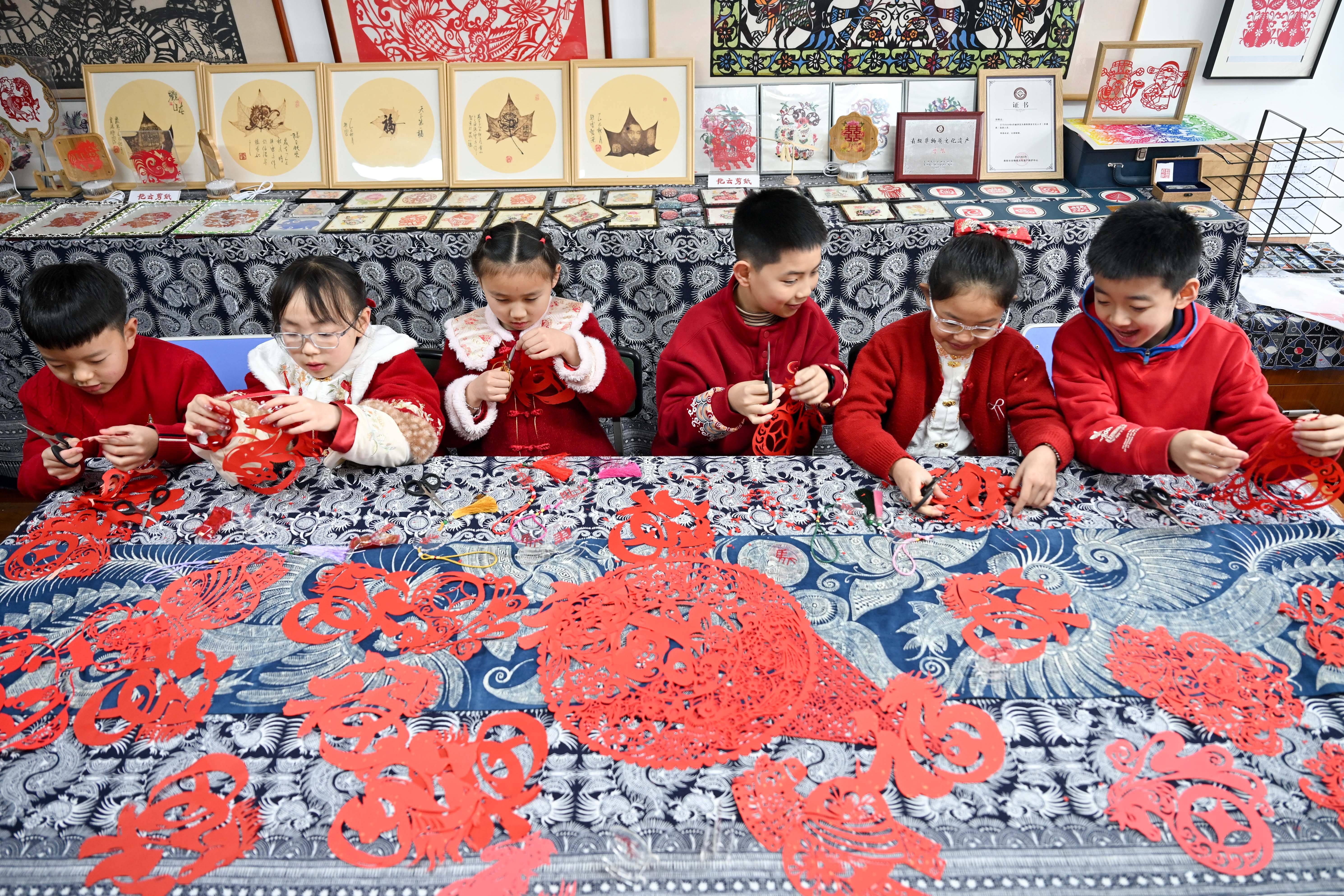 2月3日,在贵州省贵阳市省府路小学,学生在老师的指导下创作马年主题剪纸作品。 新华社发(袁福洪摄)