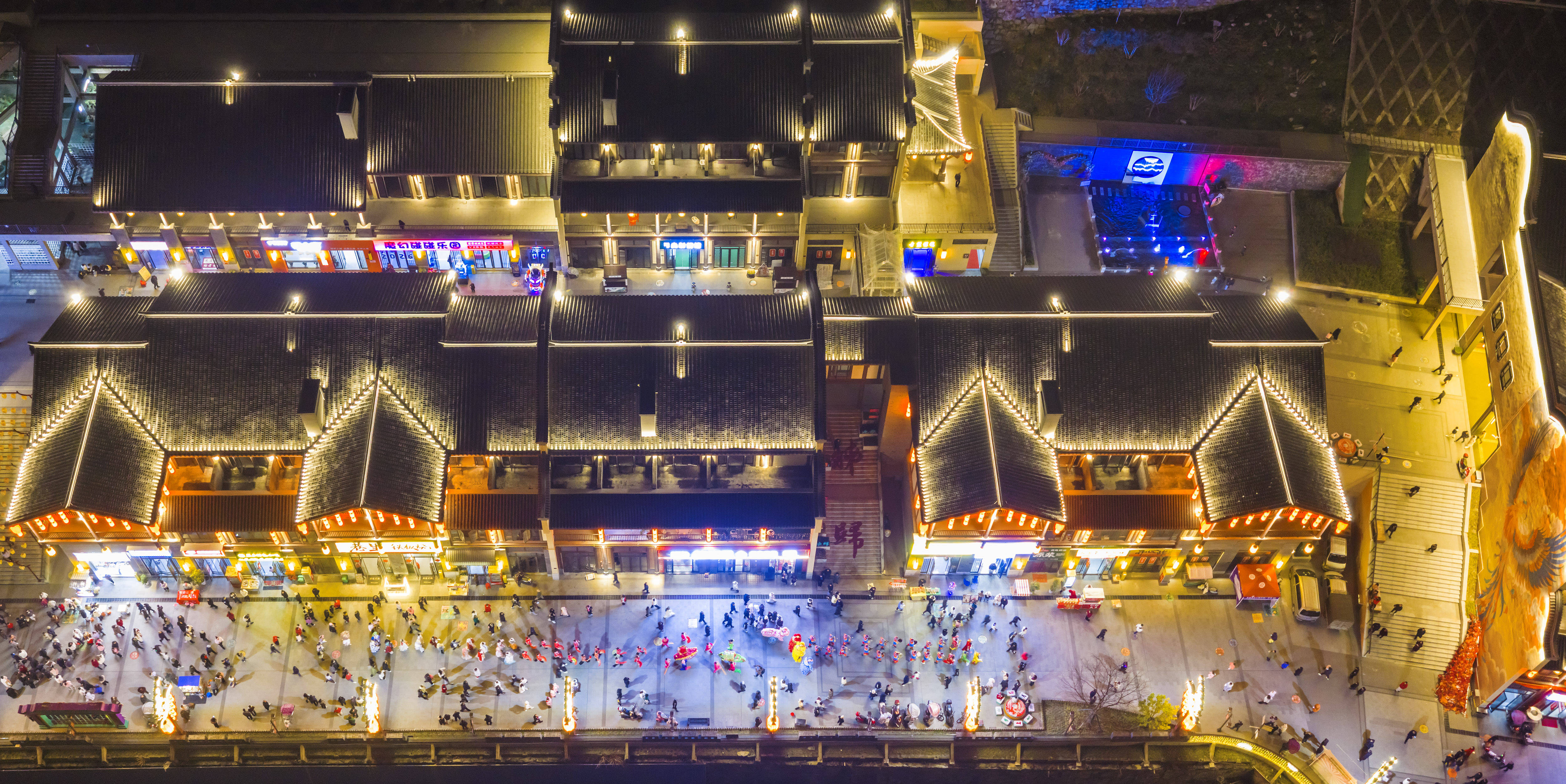 1月31日晚,湖北省宜昌市秭归县非遗传承人在九歌巷子举行龙狮巡游(无人机照片)。 新华社发(郑家裕摄)