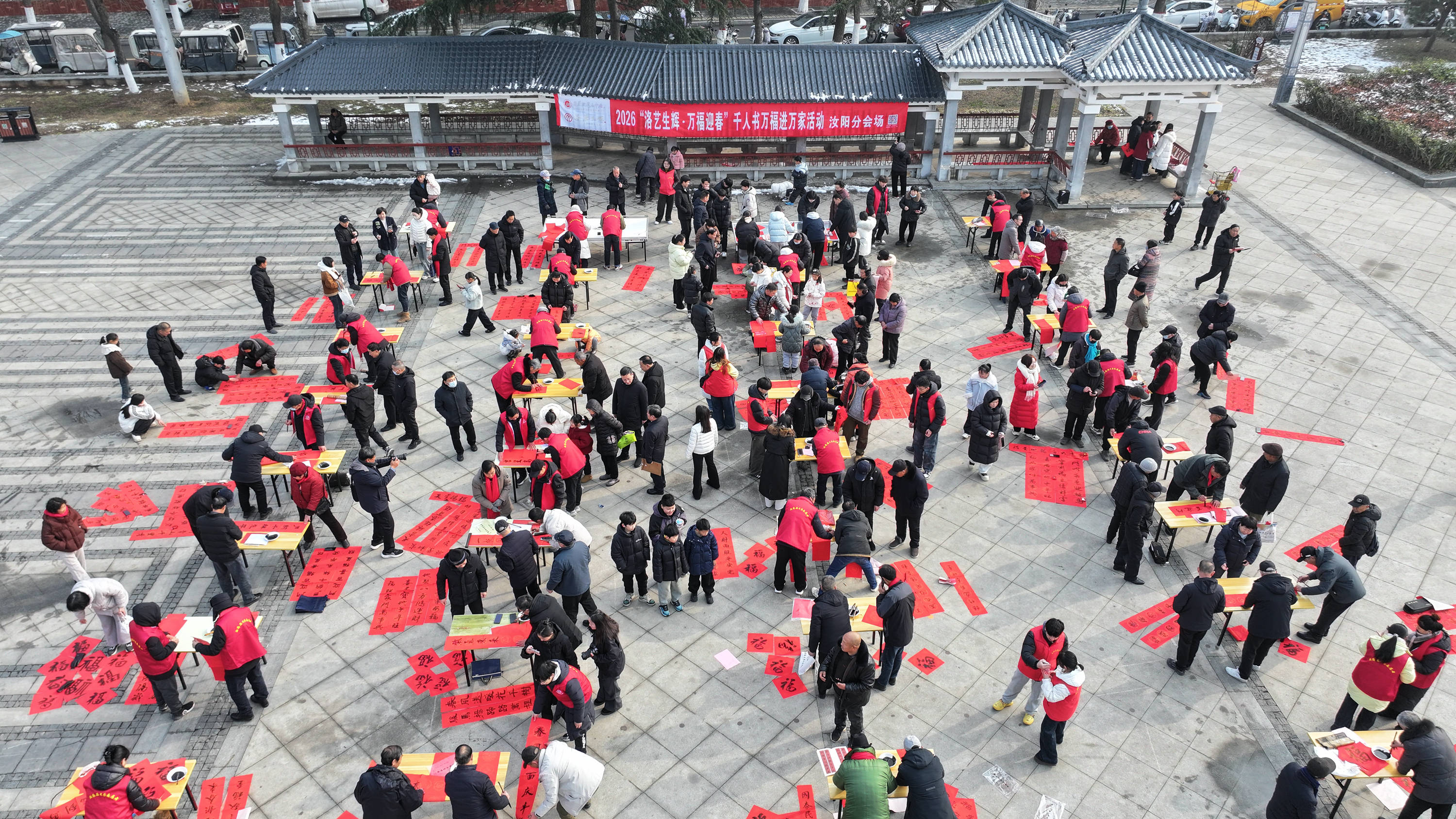 1月31日,河南省洛阳市汝阳县人民文化馆组织书法爱好者在刘伶广场给市民义写春联(无人机照片)。 新华社发(康红军摄)