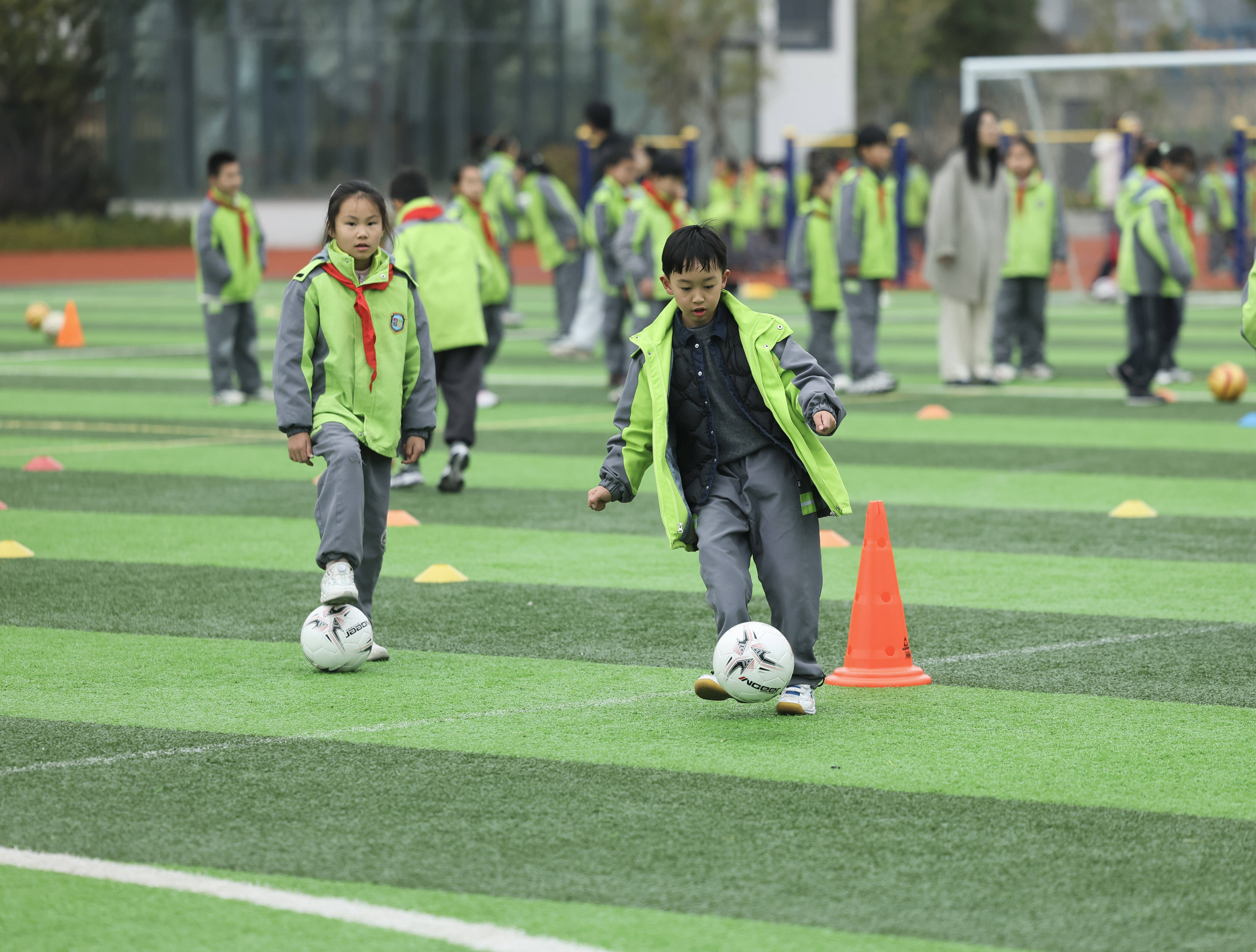 3月5日,嘉兴市实验小学亚欧校区的学生们在参加开学第一课足球训练。 新华社记者 徐昱 摄