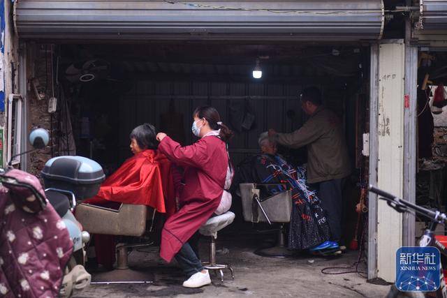 ↑ 在柳州市柳江区进德镇集市,人们在老街理发店理发(1月29日摄)。新华社记者 王婧嫱 摄