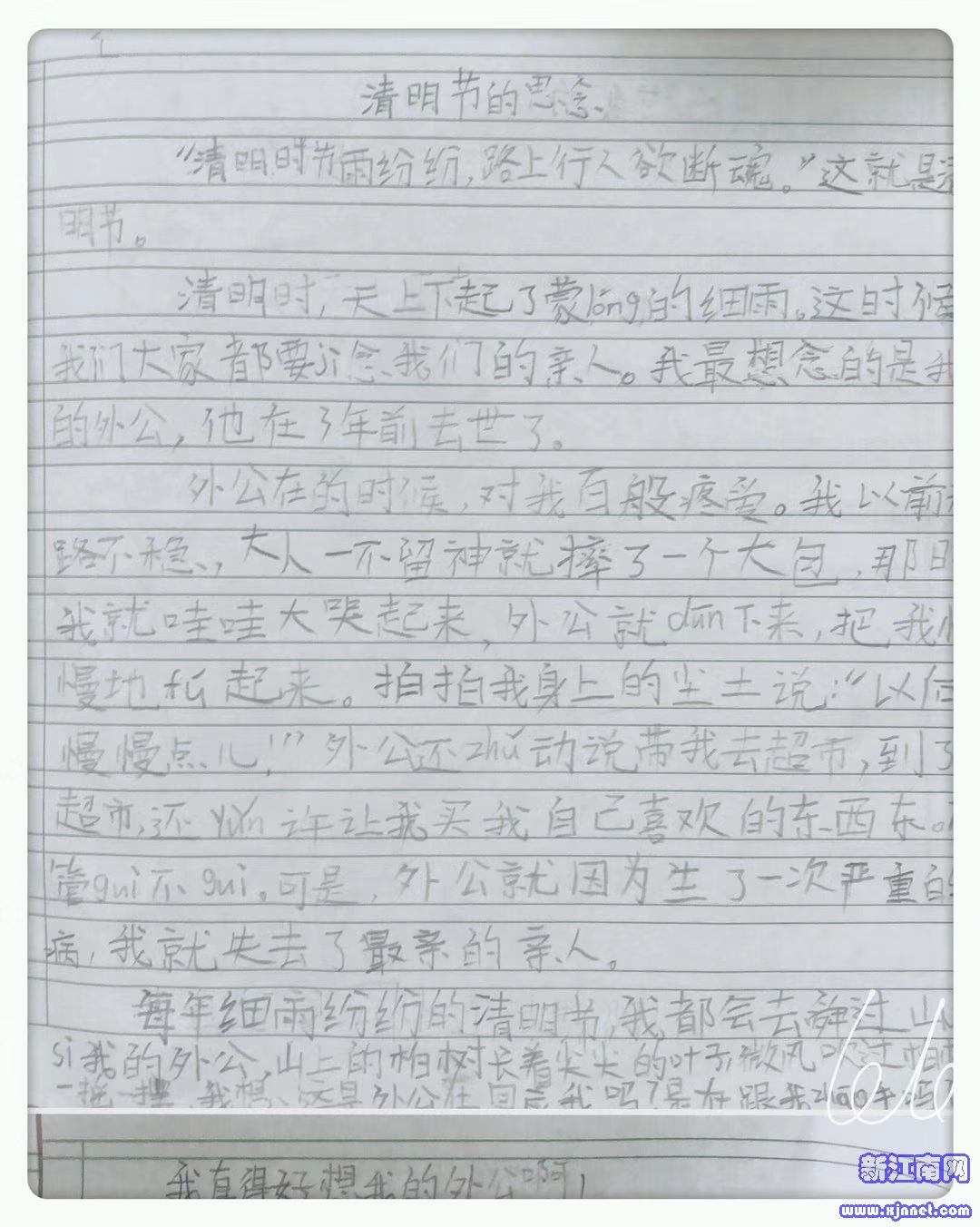 又一年清明追思,我父亲已经去世八年了,这篇小作文是我儿子三年级时写的。他已经很久没有提起过外公,不知道他的怀念深深的埋在了哪里。