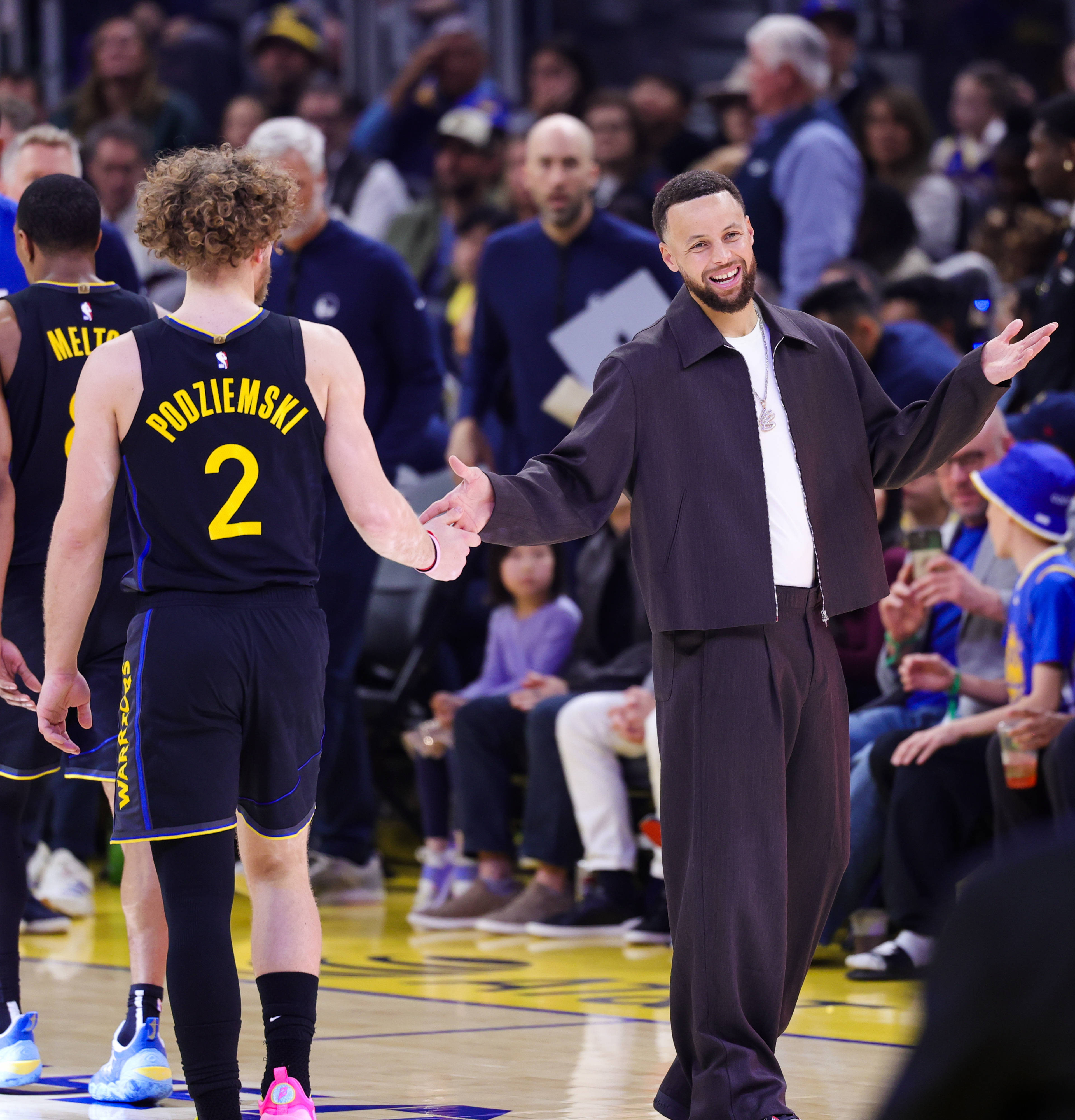 2月22日,勇士队球员波辛斯基(前左)在比赛中与库里互动。 新华社发(董旭东摄)