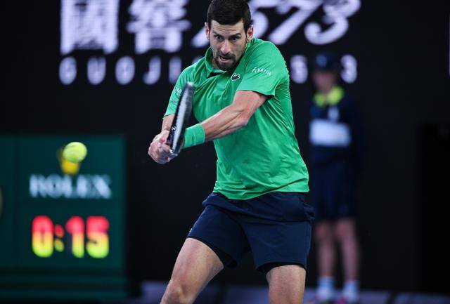 ↑焦科维奇在比赛中回球。