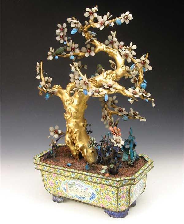 还有一件清画珐琅三阳开泰六角盆景,其树干以粉状金箔调入生漆装饰的泥金工艺制成,配以精致玉石花瓣,红宝石花蕊,生机盎然,熠熠生辉。