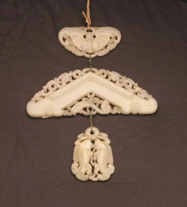 展出的清白玉雕蝠磬双鱼璧挂则是一件十分雅致的清代玉雕精品。此壁挂体积较大,雕饰流畅,拉花工艺娴熟,通体玉质洁白细腻,密度高。“工必有意,意必吉祥”。该璧挂由三部分组成,上部为扇面形蝙蝠纹,“蝙蝠”又称“蝠”,它与“福”字谐音,在古代器物中常以蝙蝠作为吉祥纹饰,寓意幸福、美满。中部为编磬状玉牌,磬身光素,边缘透雕螭纹,磬与“庆”谐音,有喜庆、吉庆的意思;下部为立式双鱼图案,双鱼谐音“余”。因此,该器物是以中国传统文化中福寿吉庆为主题的纹样,表现吉庆有余的美好寓意。