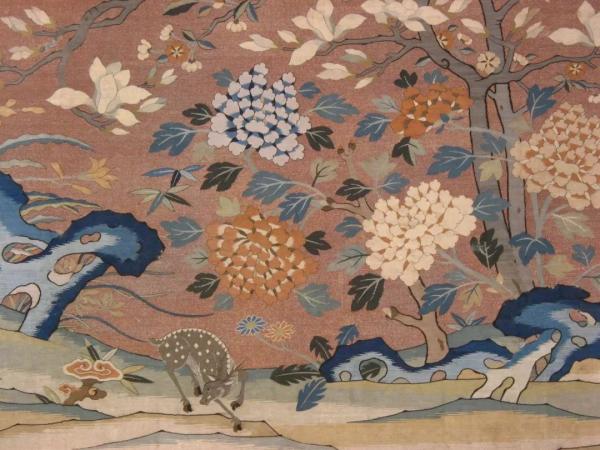 其中宫织绣类中的珍品清缂丝玉堂富贵图为乾隆年间的丝织品,横幅,画面由玉兰、牡丹、灵芝、太湖石、梅花鹿等图案组成。画面上半部为绛色地,以多组玉兰、牡丹花展现多姿多彩、满园春色的景象,玉兰、牡丹寓意“玉堂富贵”。画面下部运用深浅黄色、白色、蓝色及香色等彩色,构成横斜山坡,其上分列秀石、灵芝以及活泼的梅花鹿,亦静亦动,使美丽的自然景色融入宁静的画面。