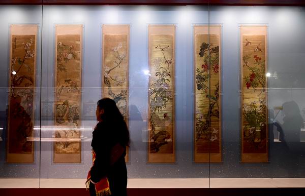 在“富丽陈设”单元,许多文物令人流连。清曹文植书掐丝珐琅万字锦地鎏金丝五言联、清黄山寿花鸟图六条屏、清金漆地滤料满字隶书八言联、清弘历行书平定两金川告成太学文及勒铭三碑卷、清朱漆描金雕云龙国宝盒、清紫檀边铜镀金万字掐丝珐琅花卉挂屏、清金漆挂屏等,都很值得好好欣赏一番。