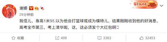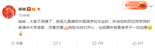 谢娜激动发文称侄子考上清华:这必须发个大红包啊
