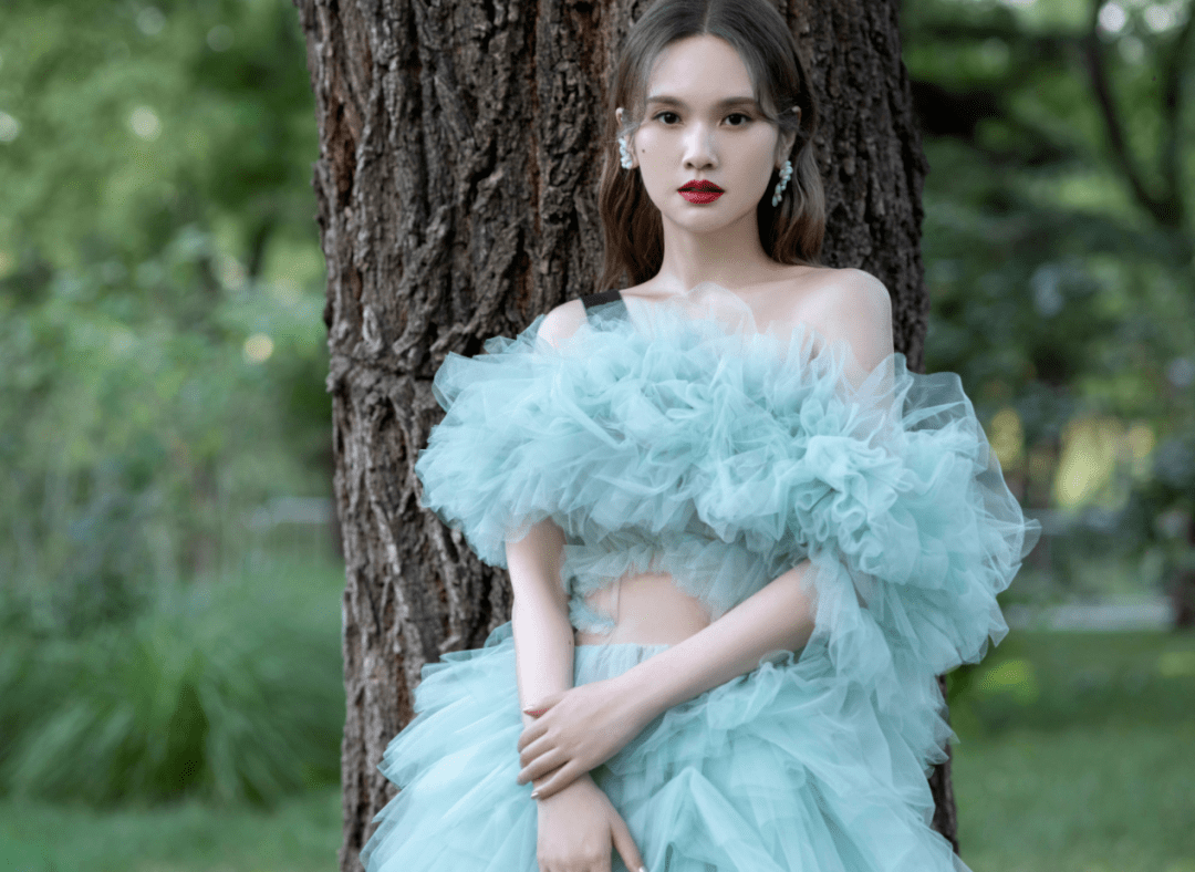 在与大树的合影中显得氛围感十足,与周遭环境相映成趣,就像林间精灵一般。