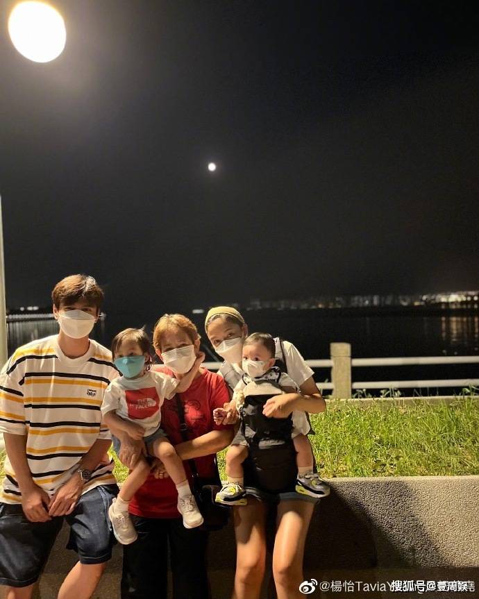 看得出来,杨怡还是非常的开心,女儿已经2岁多了,可以满地走,但是儿子才9个月,活动不是很方便,所以杨怡将儿子背在身上,一家人出来看灯饰,旁边除了老公罗仲谦之外,还有保姆一起,画面特别的温馨。