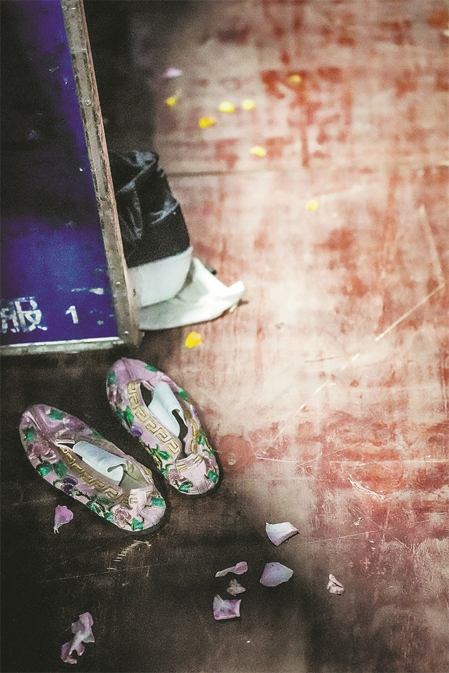 在后台的服装道具旁,饰演梁山伯与祝英台的演员们的演出鞋搁在鞋柜边,鞋跟处粘着几片花瓣,后台柔和的灯光,恰好洒落在鞋面上。