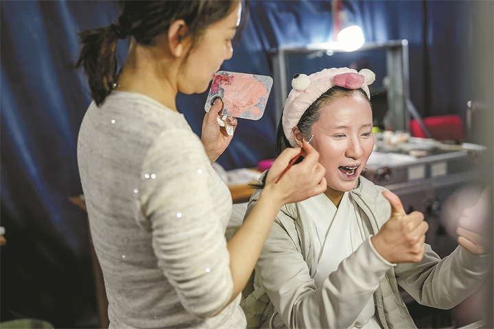 台前热闹,台后忙碌。由羽毛球场临时改造的演出后台,演员们正有条不紊地做着上场前的最后准备。主攻范派小生的越剧演员金玉皎,一边扒着晚饭一边开着网络直播;身旁的化妆师手法麻利,一刻不停地为她打理妆发。