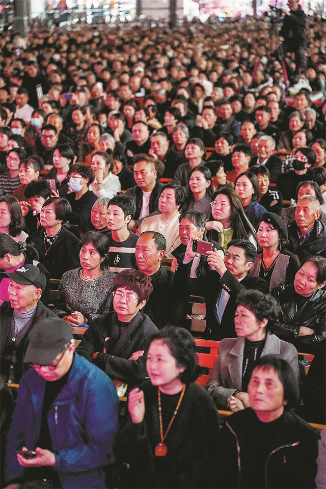这座搭建在运动场上、专门为戏迷们打造的舞台十分气派,26米长、18米宽,电子屏上始终滚动显示着集资人的姓名与金额,三机位的直播画面实时记录现场,4000个座位坐得满满当当。