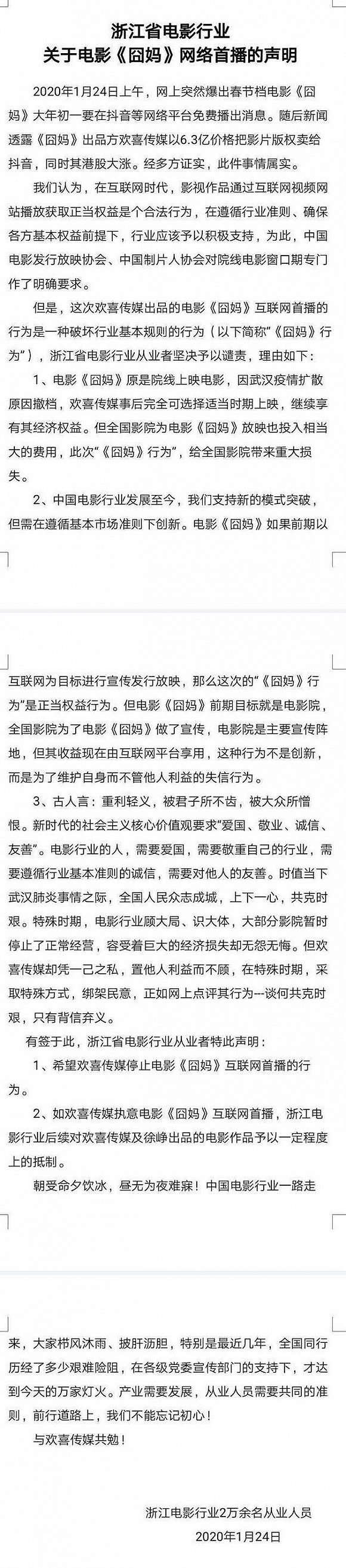 1月24日,《今日头条》通过其官方微信公众号宣布《囧妈》将于大年初一网络首播,并可免费观看,引发关注。浙江省电影行业于今日晚间发布关于电影《囧妈》网络首播的声明,称全国影院为电影《囧妈》放映投入相当大的费用,此次“《囧妈》行为”,给全国影院带来重大损失。声明也表示希望欢喜传媒停止电影《囧妈》互联网首播的行为,否则浙江电影行业后续对欢喜传媒及徐峥出品的电影作品予以一定程度上的抵制。